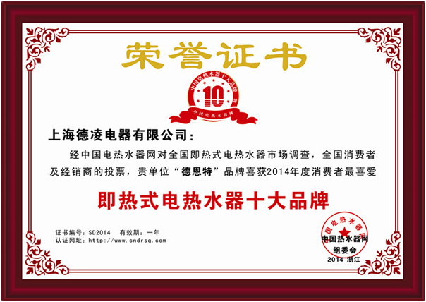 上海德凌電器有限公司經(jīng)中國電熱水器網(wǎng)對全國即熱式電熱水器市場調(diào)查,全國消費者及經(jīng)銷商投票,“德恩特”品牌喜獲“2014年度消費者最喜愛即熱式電熱水器十大品牌”并連續(xù)4年獲得排名第一。